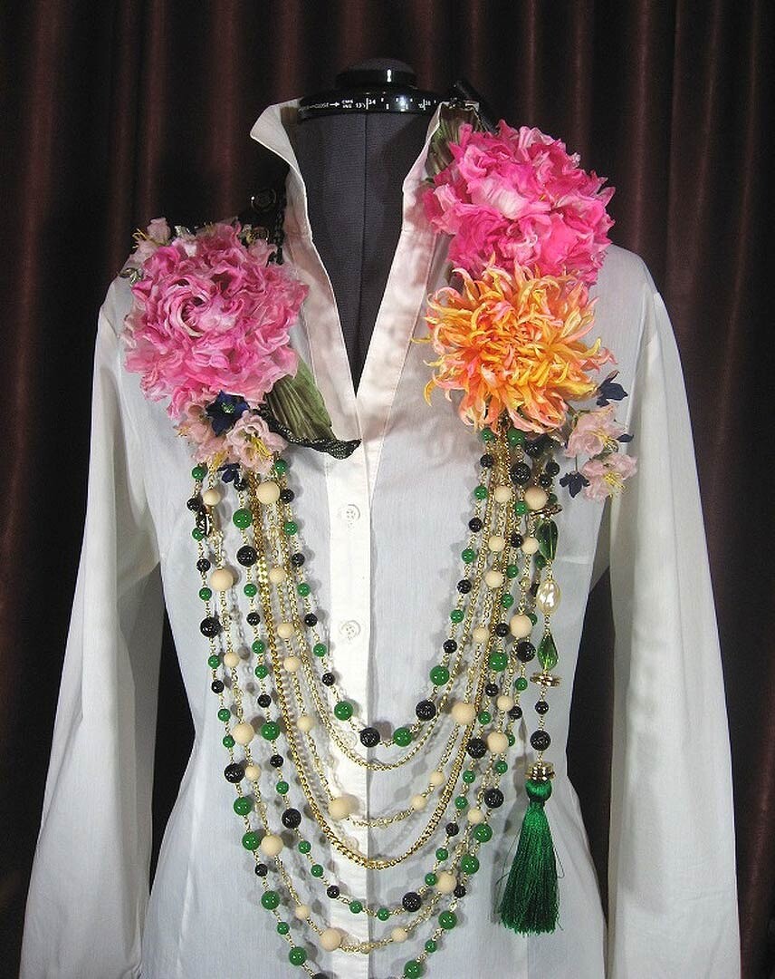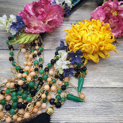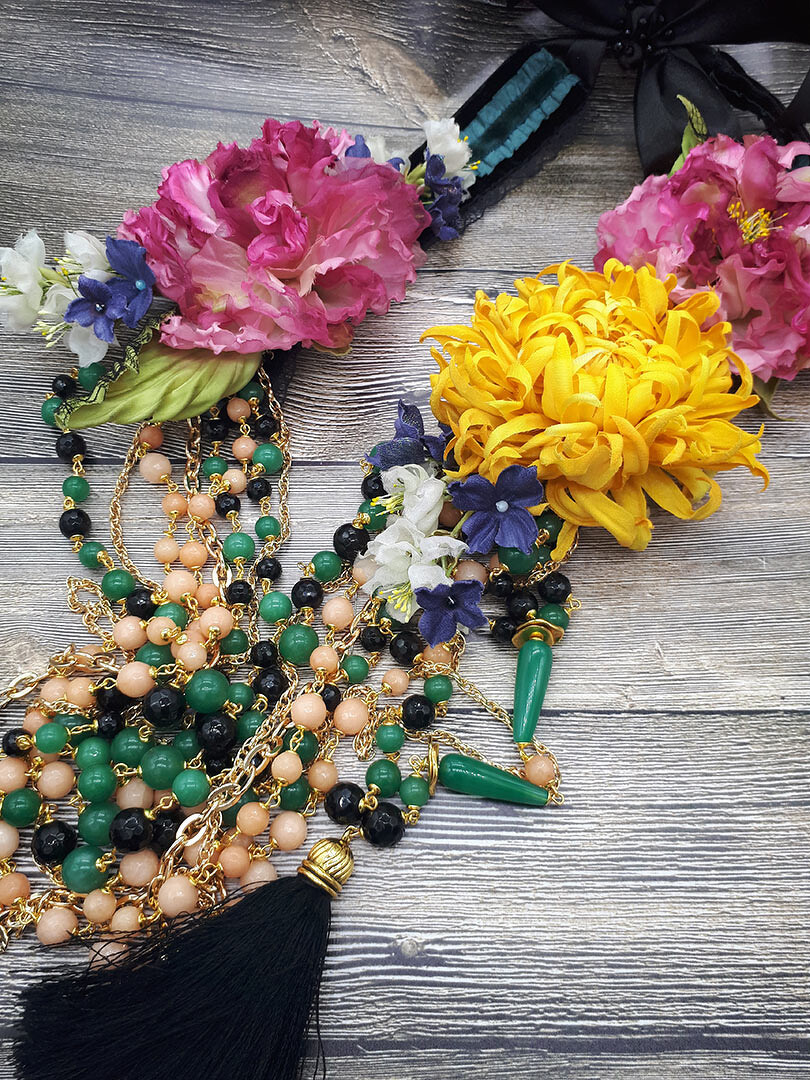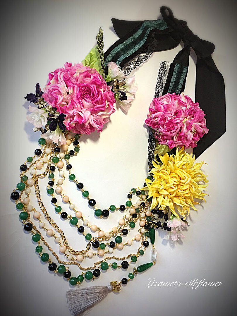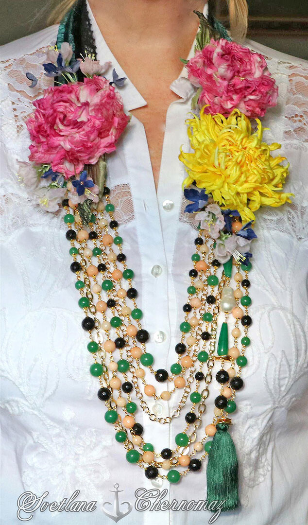 Ну видимо за счет бусин активного зеленого цвета и в сочетании с яркими цветами. Соответственно и кисточку сделала под цвет такую же зеленую, но потом сделала еще и вторую светлую кисточку которая делает колье более «мягким», как бы сбивая зелень...сложно сказать, как лучше, но мне нравится и так, и так)). Зато есть вариативность меняя кисточки, менять образ колье)).
