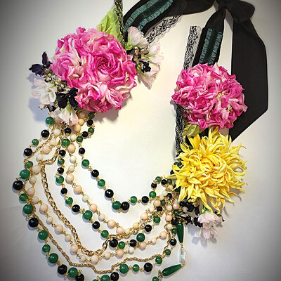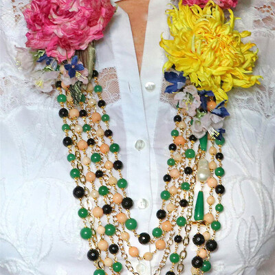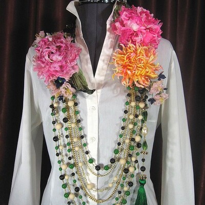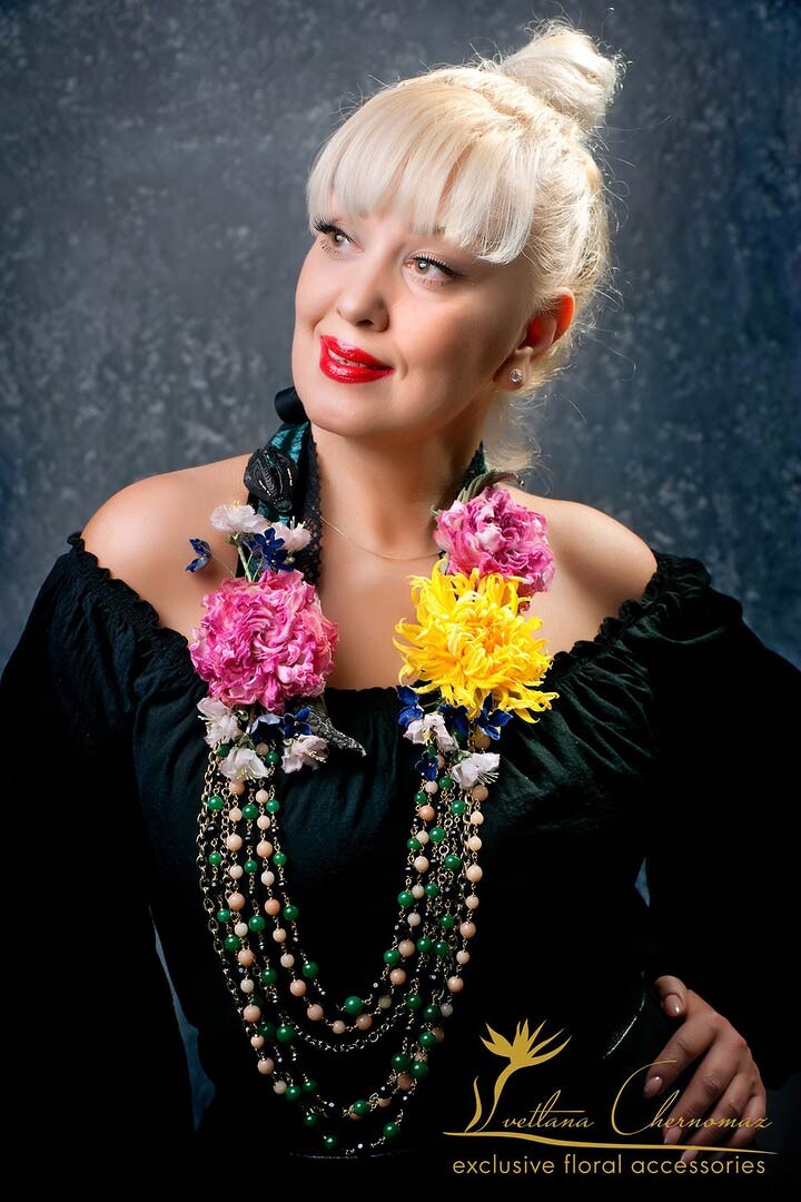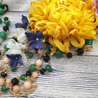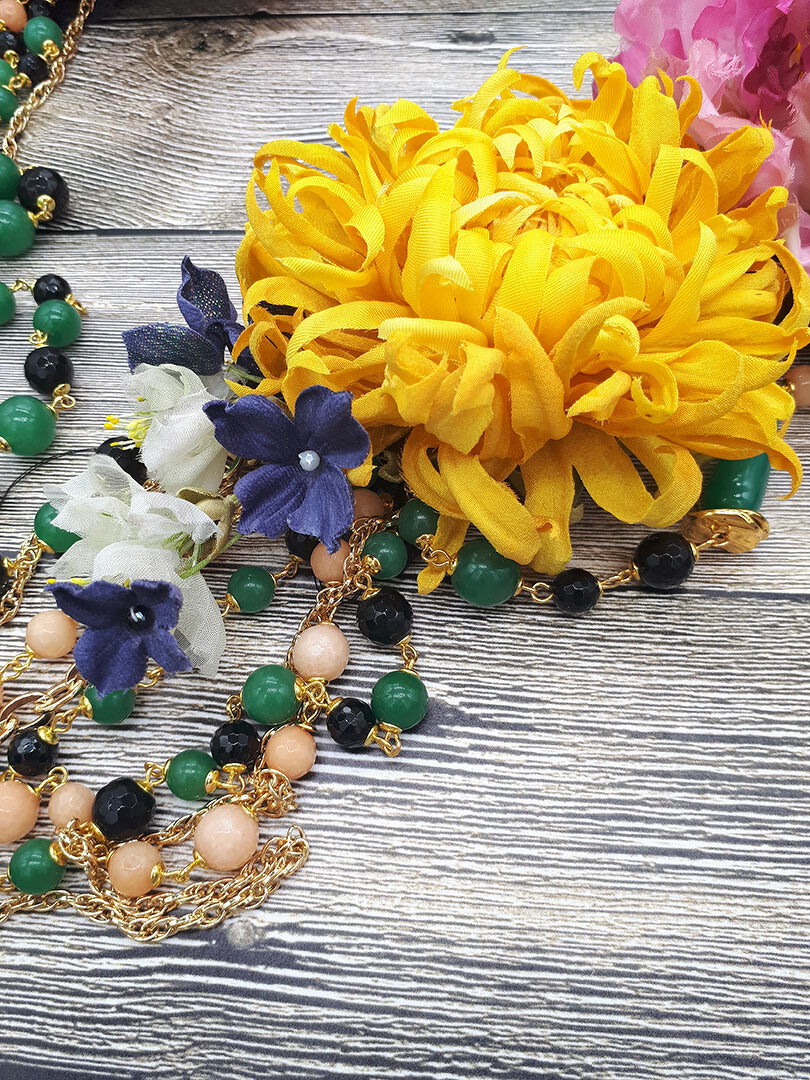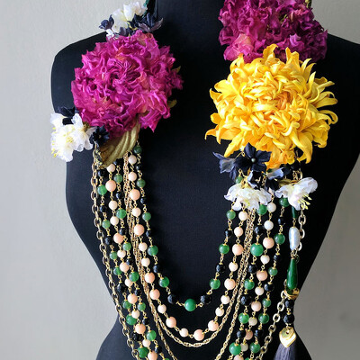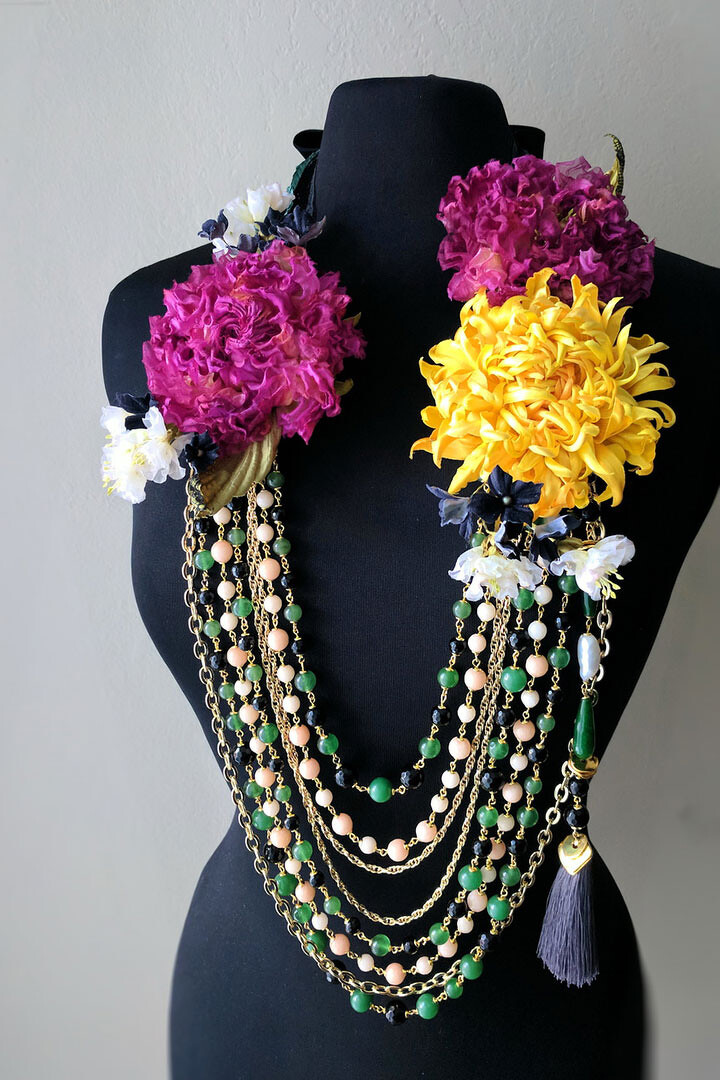 Ну видимо за счет бусин активного зеленого цвета и в сочетании с яркими цветами. Соответственно и кисточку сделала под цвет такую же зеленую, но потом сделала еще и вторую светлую кисточку которая делает колье более «мягким», как бы сбивая зелень...сложно сказать, как лучше, но мне нравится и так, и так)). Зато есть вариативность меняя кисточки, менять образ колье)).