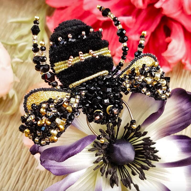- При изготовлении шмеля мы познакомимся с новыми материалами, такими как трунцал и синель, которые любят вышивальщики за их необычный вид и богатую палитру. А также сделаем потрясающие крылья, усовершенствуя знакомый прием заполнения плоскости, который впоследствии поможет нам расшивать тела бабочек и жуков, изготавливать диковинные фрукты и вышивать невероятной красоты крылья бабочек стрекоз, грудки и крылья птиц.