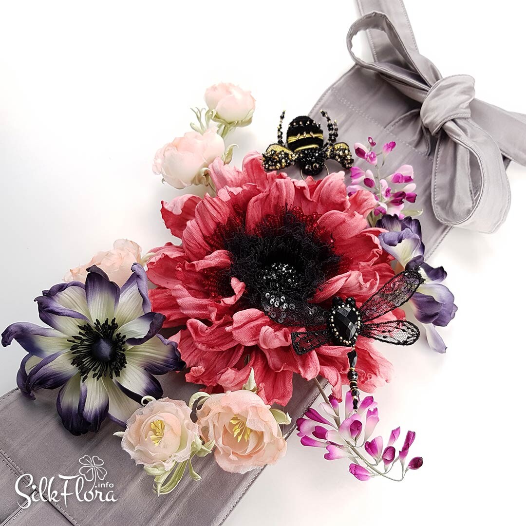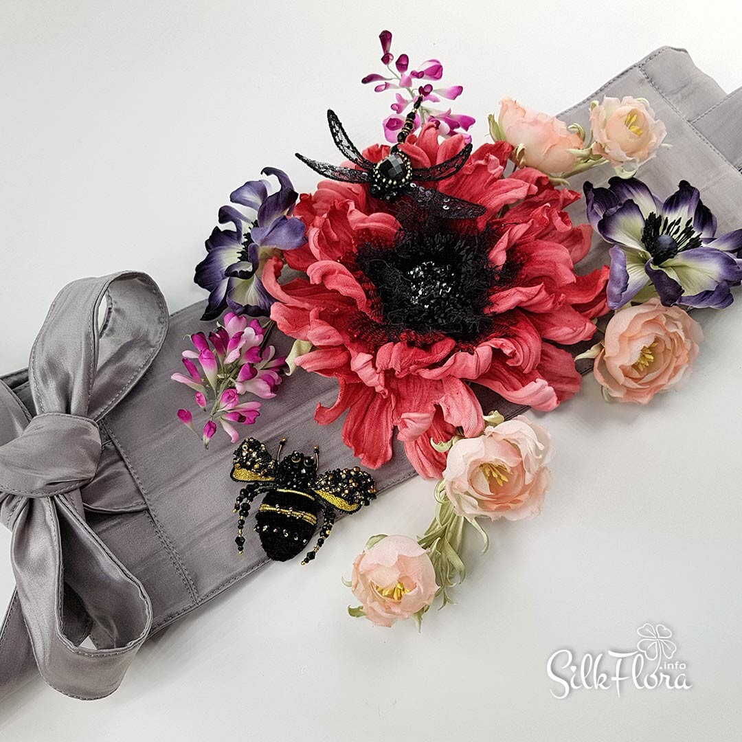 Мои слова благодарности нашему учителю Полине, за приобретенные навыки, умения, поддержку и веру. Спасибо Школе Silk Flora, отдельно хочу поблагодарить Лауру за ее помощь и быстрое реагирование и стремление помочь. Курс сложный, проделан огромный труд. Я занимаюсь шелковой флористикой ровно год и для меня это личностный успех! Я счастлива приобретенным навыкам и умениям. Мой кушак получился не совсем таким как он изначально задумывался. К сожалению, платье как картина изначально задавало тон и я понимала, что и в каких красках и цветах должно быть. Положа руку на сердце скажу, что мак у меня не получился: мягкие лепестки, громоздкий..... С маком мои цветы подружились, а вот со мной нет. Я его сделала 2 раза и не смогла приблизится к Полининому, значит все впереди и есть к чему стремится. Из пробных цветочков в дополнение к поясу сделала маленькую бутоньерку. Как говорится, у творческого человека брака не бывает.