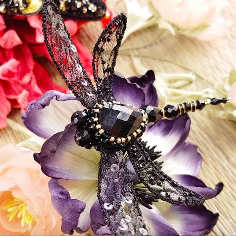 - На стрекозе мы рассмотрим технику изготовления прозрачных крыльев и возможности их декорирования люневильским крючком, введем новые техники, которые пригодятся для изготовления не только плоскостных, но и объемных вещей. Сделаем гостей нашей композиции съемными, научимся закрывать задники брошей.